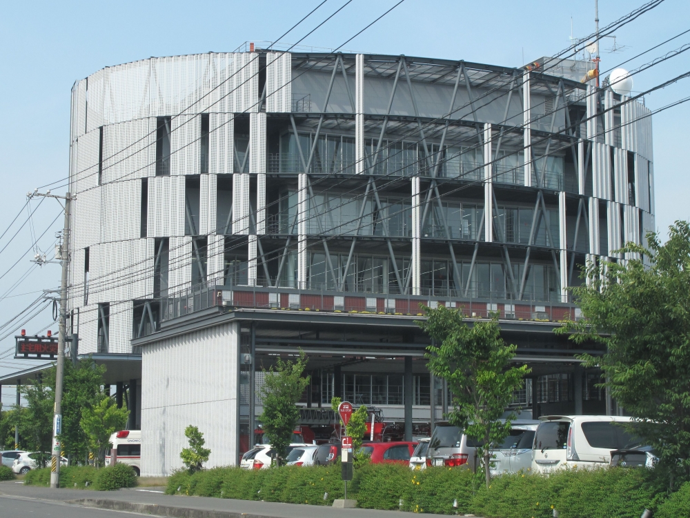 この建物は、市内西則末町にあった消防署が老朽化により耐震基準を満たさなくなったことに加え、広域化に対応する必要から全面移転したものです。庁舎屋上には県内初の常設消防防災用ヘリポートも設置されています。