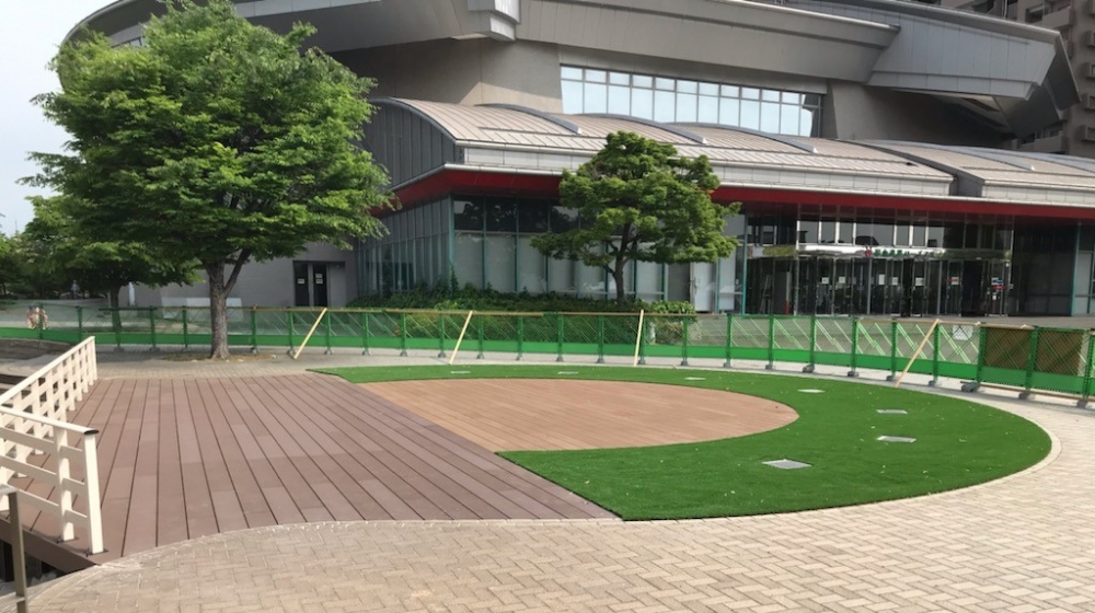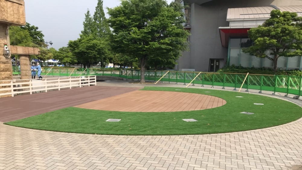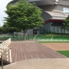福山市の緑町公園内ローズアリーナ前の親水広場に整備された噴水施設です。ウッドデッキ、人工芝、手すりの工事を担当させて頂きました。遊戯用噴水広場として、市内公園では初めての施設となります。